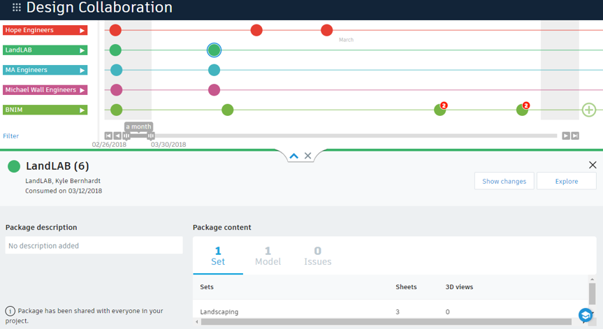 Timeline nodes represent either packages (circles) or standalone models (squares). Basic interactions with the timeline nodes include previewing and exploring package details. See the Timeline Symbols topic for more information about what each node on the timeline represents.