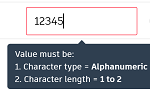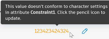 If a text field attribute has character setting constraints applied and your value doesn't comply with those restraints, guidance will display detailing the correct character length and type required.
