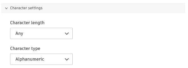 Note: You can add the following Character length and Character type constraints only for projects created after March 24, 2021.Character length: Select from Any, Fixed, or Range.