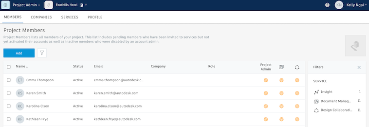 As a project administrator, you can add account members to a project and manage which activated modules they can access. You can also resend project invitations and remove members from a project.