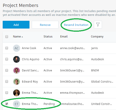 Click the checkbox next to the name of one or more members who are shown as Pending under the Status column. The Resend Invitation option will appear next to the Add and Remove features.