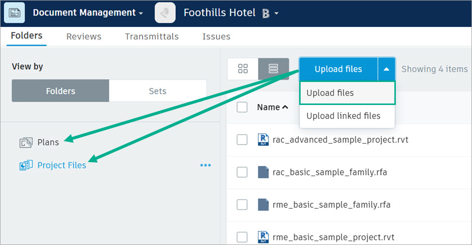 Use the Plans and Project Files folders to upload and organize your documents and models according to your needs. Learn about the differences between each folder type.
