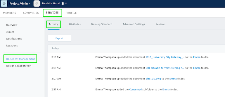 When any changes are made to your projects that use the Document Management module, they are recorded in the Activity log. You can view the activity and export the log as an Excel spreadsheet based on a selected date range.
