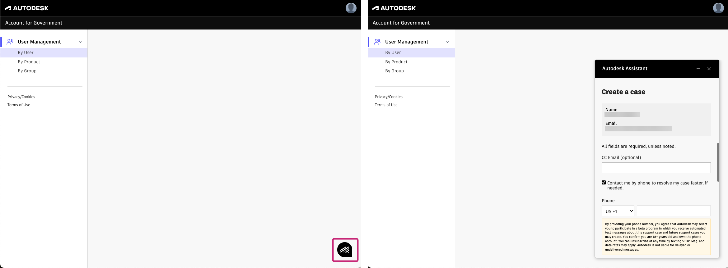 Answer 6: In the Autodesk Accounts portal for AFG, you can open the Autodesk Assistant to create a support case. When you open the Autodesk Assistant, fill out the required fields and click Submit to create a case.