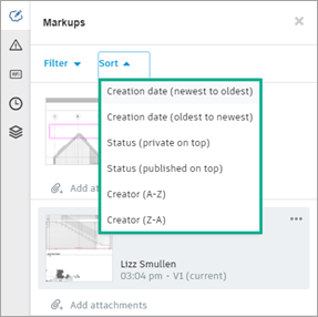 in the top-left corner to open the Markups panel, click the Sort drop-down list, and then select the desired sorting option.