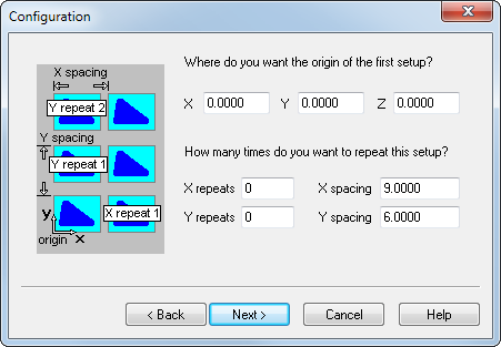 - If you want to repeat the Setup in the multiple fixture document, enter the number of repeats and the spacing between Setups. Repeated Setups are organized in a rectangular array.
