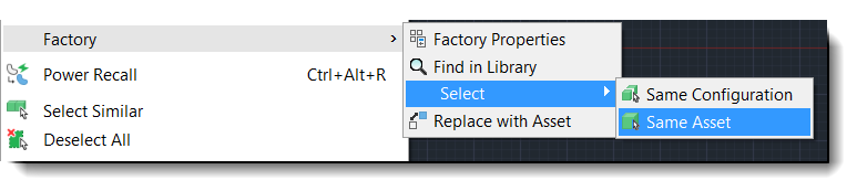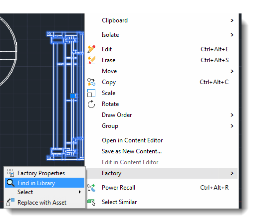 If you ever need to find where a placed asset is located in the asset library, perhaps to edit the asset or make copies, right-click on the asset in the layout and select Factory > Find in Library.