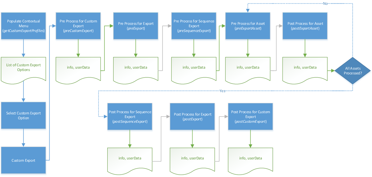 pre_custom_exportOptional. Called if required byget_custom_export_profiles. Called when the context menu item defined by getCustomExportProfiles is selected by the user.pre_exportAlways called. In a regular export,pre_exportis called as the Export window is displayed to the user. In a custom export, called afterpre_custom_export.pre_export_sequenceAlways called. Called before writing the sequence.pre_export_assetAlways called. When it is called depends on the export option. With Foreground Export, allpre_export_assetare called for each assets immediately in one go. With Background Export, eachpre_export_assetis called as each asset job is submitted to Backburner.post_export_assetAlways called. Called after an asset is written. Can be done in backburner as determined by useBackburnerPostExportAsset.post_export_sequenceAlways called. Called afterpost_export_asset.post_exportAlways called. Called afterpost_export_sequence.post_custom_exportOptional: called if required byget_custom_export_profiles. Called afterpost_export.