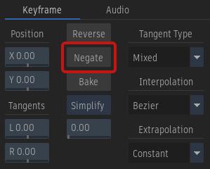 Negate flips a channel or a group of keyframes vertically. Reverse flips a channel or a group of keyframes horizontally.