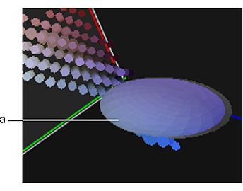 The tolerance sample in the RGB viewer is represented as an ellipsoid by default. The ellipsoid shows you the location, in RGB colour space, of the range of colours included in the sample. All colours in the tolerance ellipsoid are black on the matte.