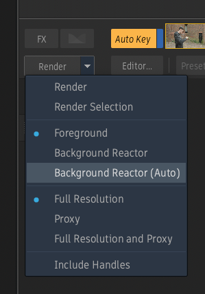 Each environment (Conform, Timeline, Effects, and BFX) has its own rendering setting (foreground or background). The default Rendering mode (Foreground, Burn, or Background Reactor) is defined in the General Preferences, under the Default Rendering Options section.