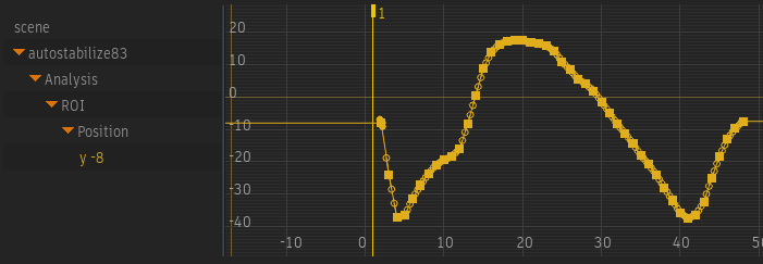 For example, the following figure shows an animation curve created using the Stabilizer. Simplify is applied with a value of 20. In sections where the slope of the curve is fairly constant in one direction, keyframes are removed between the peaks and valleys. You can adjust the simplified animation curve more easily because there are fewer keyframes to modify.