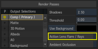 For this use case, make sure that you disable the Action Lens Flare / Rays button from the Comp output Render Passes menu: