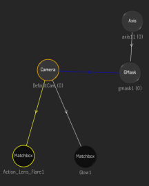 In this example, there is also a Matchbox Glow effect in the Camera FX pipeline, as well as a GMask that allows you to blur part of the Lens Flare result without affecting the Action result. The Glow can affect both the Lens Flare and the Action result, since the ActionLensFlare Matchbox allows you to place it anywhere in the rendering pipeline (and in this case before the Glow effect).