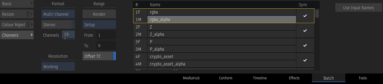 - Edit the name directly in the Channels list. If there is a check mark in the Sync column, you can only rename the Front of the channel: the Matte uses the same name but is appended _alpha.