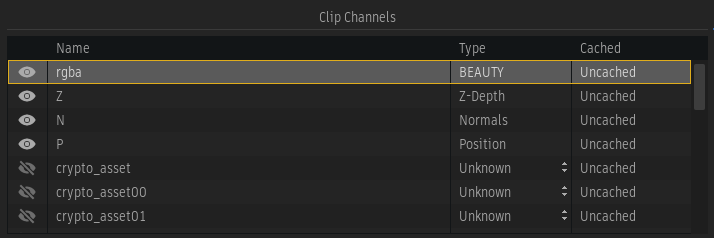 Updated Channels table. In addition to the new Type and Cached columns, the Channels table in the Extended menu of a Clip node contains the following improvements.