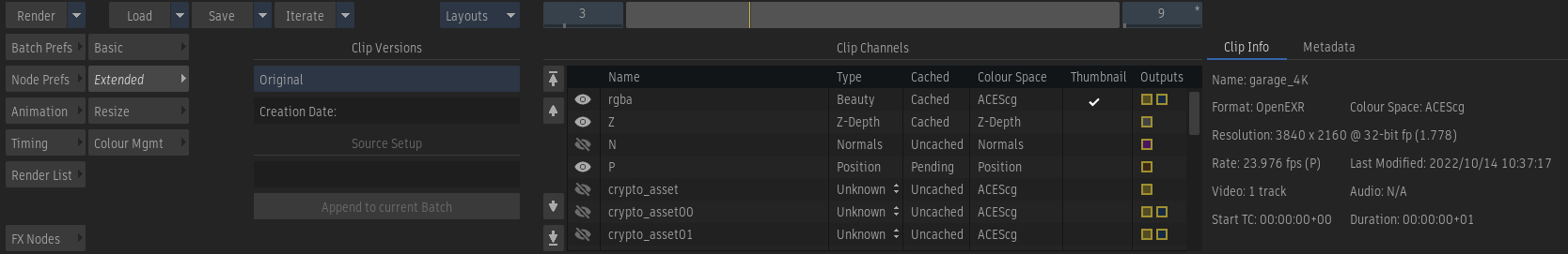 Hidden channels do not appear in the clip node in Batch, Batch FX, and Modular Keyer. This simplifies the schematic, allowing you to ignore those channels that are not required for your work. In a Timeline, hidden channels are not available from the channel selection drop-down menu at the segment level.