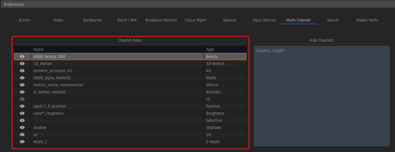 Use the Multi-Channel Channel Rules to map a channel type to a channel name. A channel name comes from the clips that you import. This name is given to the channel when that channel is created in another application such as Autodesk Maya. The default preferences contain standard channel names, but you can add or remove channel names from the list.