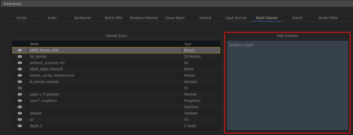 Preferences Multi-Channel is a GUI editor for /opt/Autodesk/cfg/channelrules.cfg. If you're used to editing channelrules.cfg directly, consider using the preferences panel as it should reduce errors made when manually editing the file.