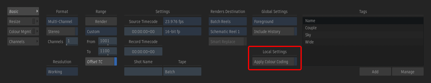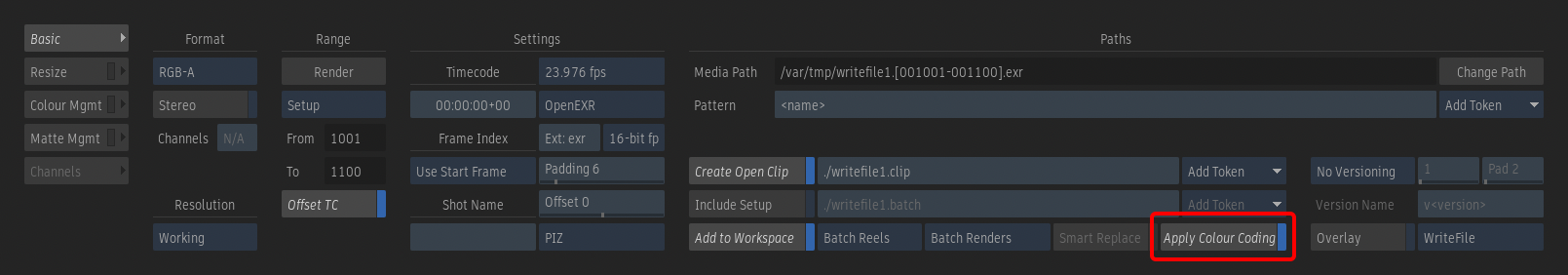 The colour coding of a Render or Write File node can be propagated to the clips originating from them using the Render or Add to Workspace functions. This can help identify from where a clip was rendered. To apply the colour coding to a rendered clip, enable the Apply Colour Coding button in the Local Settings section of the Render node or Add to Workspace section of a Write File node.