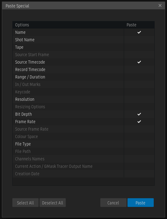 Paste Special, you select the metadata to paste. Only the information relevant to the node are available. For example, you cannot paste a shot name on an GMask node, but you can paste it to a Render node.