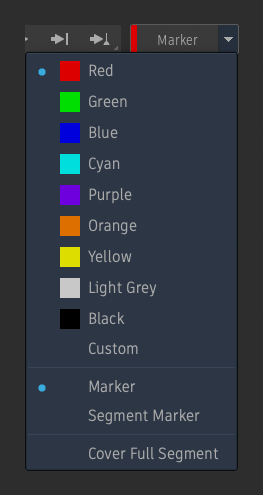 By default, the Marker button adds a Marker. This can be changed to add Segment Markers by selecting Segment Marker in the drop-down button. The title on the button changes from Marker to Seg Marker to indicate what type of Marker you will be adding next.