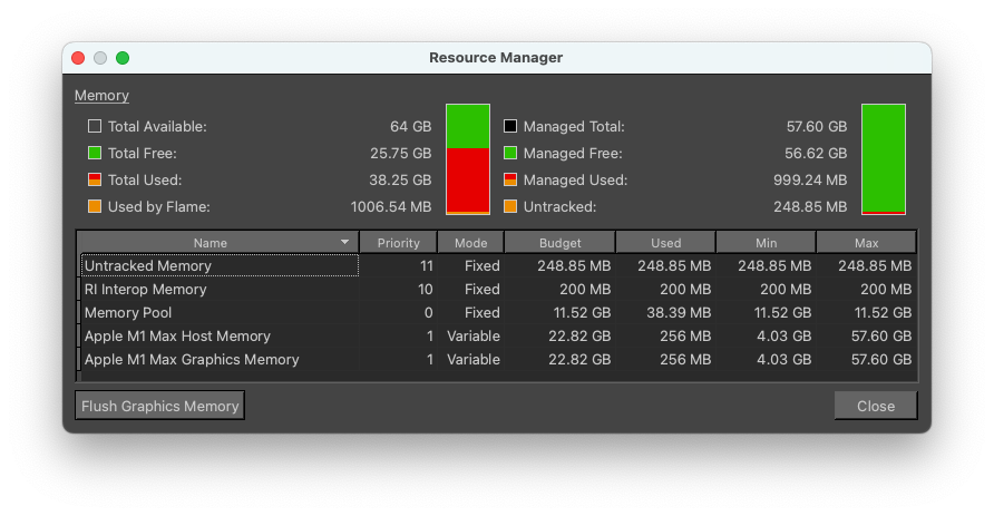 A Resource Manager utility is available from the Flame menu. The Resource manager indicates the amount of RAM and VRAM that are Available, Used by the system, Used by the application, and Free. It also lists the RAM and VRAM clients, and details their memory consumption.