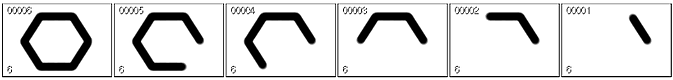 The following shows how a hexagon is drawn over six frames. One edge is drawn in each frame. After the object is converted to AutoPaint strokes, it is always drawn as an outline regardless of its attributes in the Graphics menu.