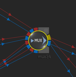 You can emulate this behaviour by adding your own MUX nodes to the schematic. If you need more inputs in your MUX node, use the Amount field in the MUX menu to set the number of inputs needed. To switch between inputs, use the Selection field to choose which input is active (this field can be animated with keyframes).