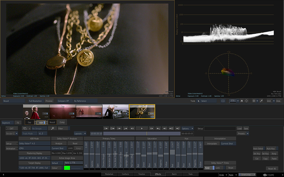 Dolby Vision® technology for HDR authoring and display workflow. Use the new HDR track to manage Dolby Vision metadata, perform content analysis using Dolby Vision CMv2.9 and CMv4.0, monitor through iCMU, eCMU, or HDMI tunneling, import and export Dolby Vision XML files for collaborative workflows. Flame Family products version 2021.0.1 have been certified by Dolby Laboratories® as compatible with Dolby Vision™. |
