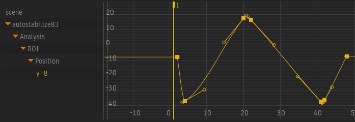 For example, the following figure shows an animation curve created using the Stabilizer. Simplify is applied with a value of 20. In sections where the slope of the curve is fairly constant in one direction, keyframes are removed between the peaks and valleys. You can adjust the simplified animation curve more easily because there are fewer keyframes to modify.