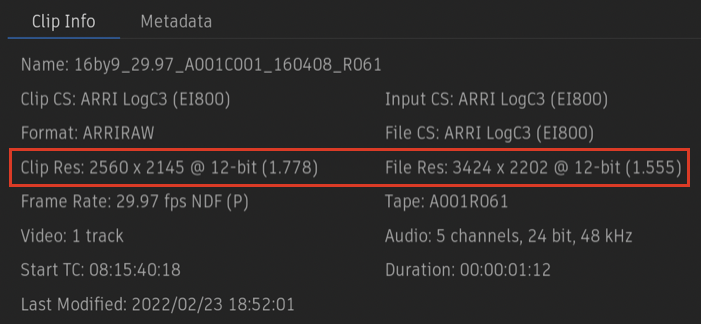 Select Full to use the full sensor resolution of the camera, which appears as the File Res in the Clip Info tab. Select Camera to use the cropped resolution set by the camera at capture, which appears as the Clip Res in the Clip Info tab.
