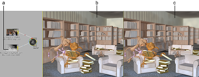 A depth of field map (Z-depth map) can be connected to the node. Black portions of the map are in focus. White portions display the highest level of blur. Note that a Z-depth map imported from another application may use the opposite convention and may need to be inverted.