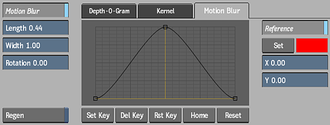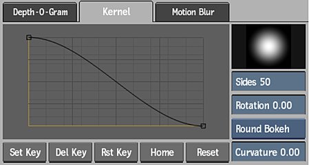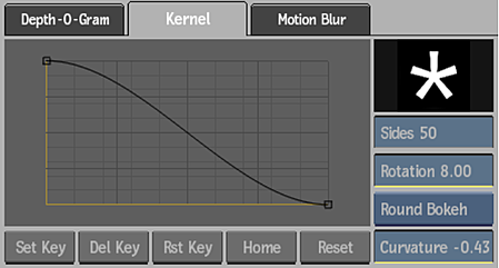 The kernel is the basic blur shape. The shape of the kernel is determined by its number of sides, its rotation, and the shape of its S-curve. This curve represents the shape of the pattern, from its centre to the outside. The default S-curve defines the softness of the blur. You can change the curve by manipulating the two points that define the curve, or you can add points to the curve. Use the Tools box to add and delete points on the curve.