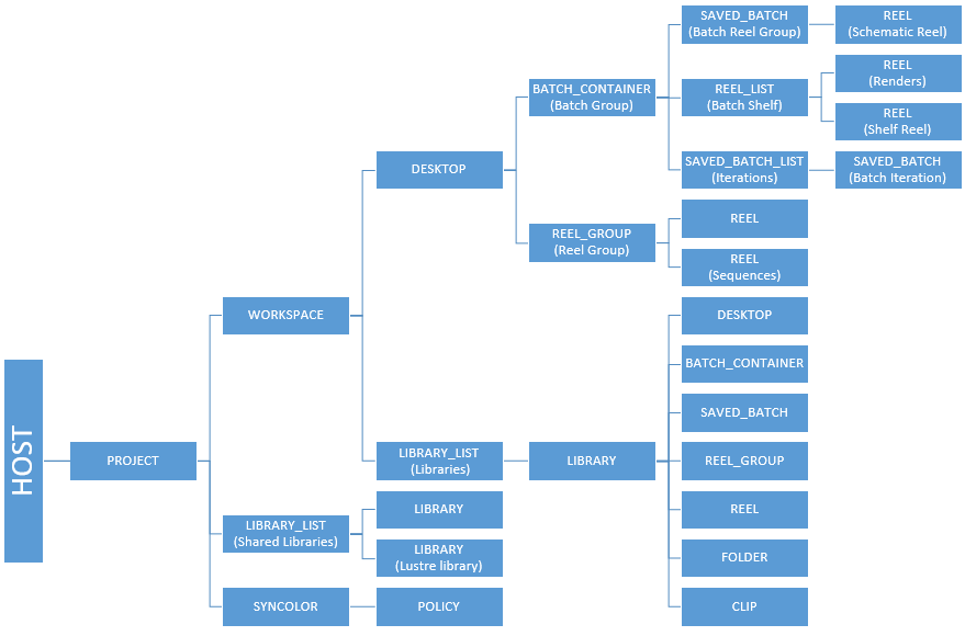 PROJECT | A PROJECT node contains the entire creative finishing project containing all Workspaces and shared libraries, including clip libraries and setups for the various Creative Finishing modules that are used for the project. It also exposes metadata describing the project. Project metadata can be accessed as explained in Getting and Setting Metadata on a Project Node. PROJECT nodes are children of the PROJECTS node. A PROJECT node has the following child nodes: