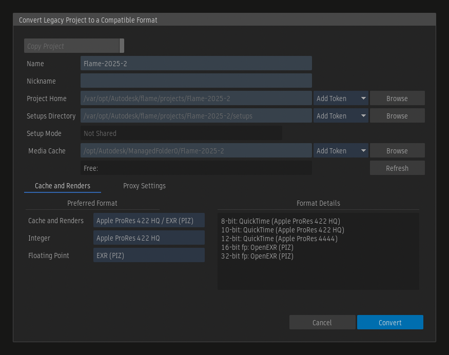 By default, for a project originally created in a version older than the 2026 release, the location of the media cache is set to the same file system as the volume of the original project. The conversion of the project creates file system hard links to avoid media duplication. If the original legacy project is deleted, the managed media will be deleted without impacting the converted project.