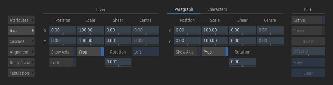 The Centre X and Y parameters can be used to customize the position of the axis, affecting how the Scale and Rotation attributes of a Paragraph are applied.