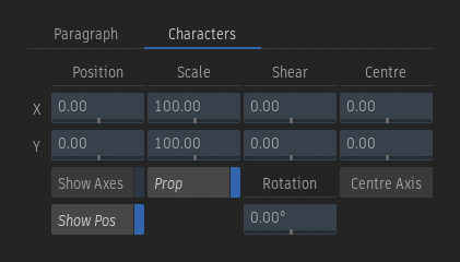 Use the Position, Scale, Shear, Centre, and Rotationparameters to adjust the attributes of a Paragraph.