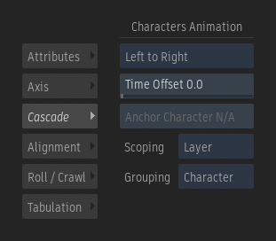 The Cascade menu contains parameters used to offset the timing of animated character attributes, making it possible to create effects such as a reveal or characters popping.