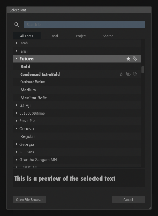 Fonts can be set as favourites, hidden, or given tags to facilitate filtering. This is achieved by clicking the corresponding icons inside the Select Font widget.