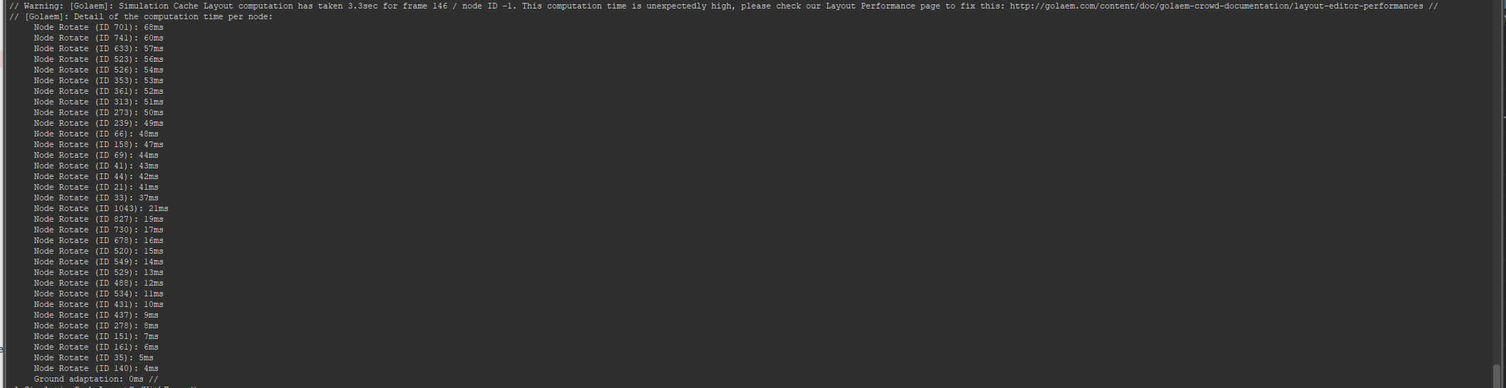 Whenever a layout computation takes longer than one second a message will appear in the Script Editor telling how long it took. If you set the Golaem Crowd Severity log Level to Info, the log will also give a detail of where the time was spent: