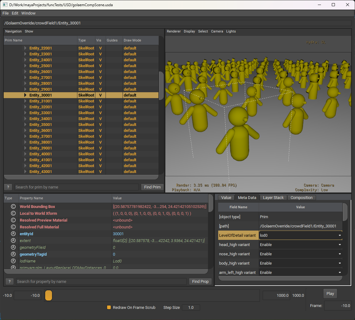 LOD (Level of Detail) is automatically enabled when baking a simulation to the USD procedural from a Maya scene where LOD is enabled (see the LOD attributes on the Crowd Render Proxy and on the Crowd Manager Node). The parameters that control LODs in the usda file are int glmLodMode and float3 glmCameraPos. glmLodMode is set to 1 and glmCameraPos is set to the position of the camera used for LOD.