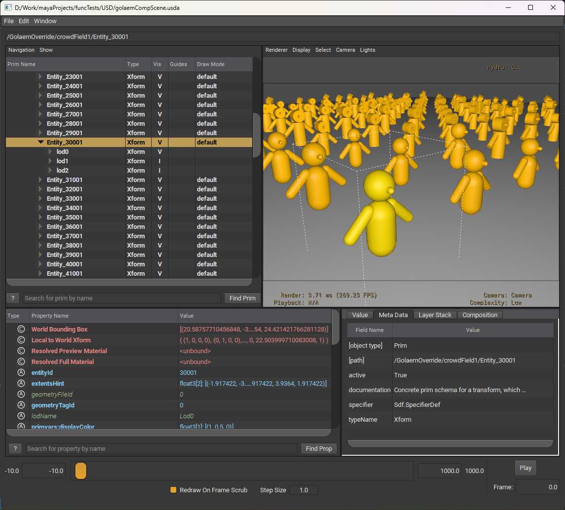 Use the glmEntityIds parameter to render only a part of the Golaem entities exported in the Simulation cache. The parameter syntax is a print-pages style string, i.e. 1001-3001, 5001-6001, 9001. You can override the USD parameters in another scene, like in the example below: