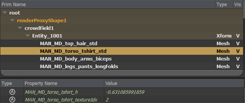 If you'd like to change any Crowd Shader properties (texture, color, displacement, multi matte IDs...), it can be done on the assigned Materials in USD (see above).