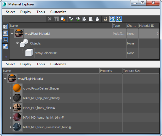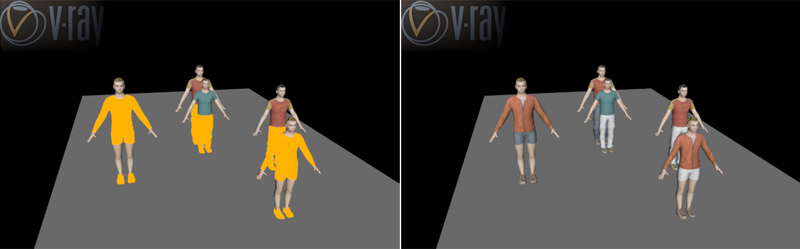 If you'd like to change any Crowd Shader properties (texture, color, displacement, multi matte IDs...), it can be done on the imported shaders in Maya (and in this case, the Shader .vrscene must be reexported) or on the assigned shaders in 3ds Max (see above).