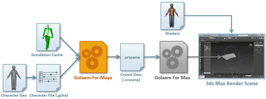 The figure below details the workflow of the render of Golaem simulations with V-Ray in 3ds Max. For a better understanding of the process, check the Golaem Rendering Workflow.