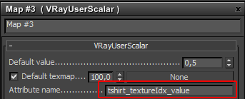 Thus, if an integer Shader Attribute called tshirt_textureIdx_value with a value between 0 and 3 has been defined on the Tshirt mesh in the Character Maker, a VRayUserScalar shader can be created and set with the same name: