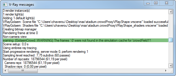 - If something fails (procedural not found, missing shaders, missing cache file...), V-Ray and/or Golaem will almost always warn you in the V-Ray messages window. A more verbose render log can be found in %TEMP%/vraylog.txt