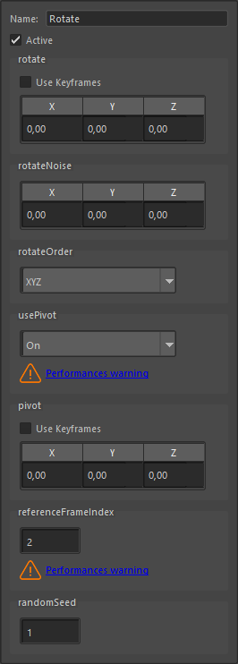 Pivot | If "Use Pivot" is true, this is the position of the rotation pivot point This parameter is keyframable, check the page explaining how to handle the keyframes in Maya If set to Off, performance might be affected. Check the Layout Editor Performances page for more information. |
