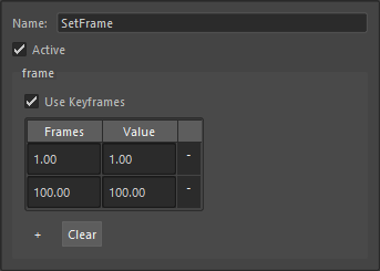 Frame | Frame to use for the affected entities. It is best using keyframes values to change the displayed frame each frame, otherwise the entities will be locked on the given frame This parameter is keyframable, check the page explaining how to handle the keyframes in Maya |